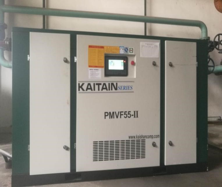 2018年公司所做的最重要的節(jié)能項(xiàng)目是空壓機(jī)改造更新項(xiàng)目,從2017年下半年就開始調(diào)研兩級(jí)壓縮型空壓機(jī),共調(diào)研了三個(gè)品牌,最終選擇在無錫地區(qū)使用較多的開山兩級(jí)壓縮空壓機(jī)。先根據(jù)測(cè)試數(shù)據(jù)確定使用200KW工頻和185KW變頻機(jī),目標(biāo)是每小時(shí)節(jié)能79kwh。7月底開始投入使用,在用氣量峰值出現(xiàn)時(shí),壓力降比較大,造成末端設(shè)備因壓力低而停機(jī),盡管正常情況下使用是沒有問題的,而且185kw變頻機(jī)使用頻率在25Hz。后經(jīng)過8、9、10三個(gè)月的數(shù)據(jù)積累和分析,確定再增加一臺(tái)11m3/h的永磁變頻兩級(jí)壓縮空壓機(jī)(功率55kw),從11月13日投入使用以來經(jīng)統(tǒng)計(jì),節(jié)能效果明顯。使用的空壓機(jī)節(jié)能核心技術(shù)是兩級(jí)壓縮和變頻以及永磁變頻。