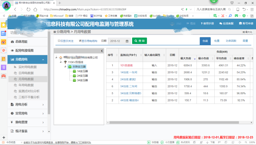 某公司2018年用電將達(dá)到3150萬千瓦時(shí),新申達(dá)信息科技有限公司(全部園區(qū)企業(yè))用電將達(dá)到4200萬千瓦時(shí)。公司于2015年起就與新聯(lián)電子合作上馬了配用電監(jiān)測(cè)與管理系統(tǒng)并簽訂協(xié)議。高低壓監(jiān)測(cè)總計(jì)18路,其中110KV高壓配電總進(jìn)線1路,10KV出線5路,低壓側(cè)12路,基本上都是輔助設(shè)備如冷凍機(jī)、空壓機(jī)、粉碎機(jī)和造粒機(jī)等。輔助設(shè)備可以根據(jù)生產(chǎn)情況控制在平、谷開啟,達(dá)到降低電費(fèi)支出的目的。下圖是配用電監(jiān)測(cè)線路圖: